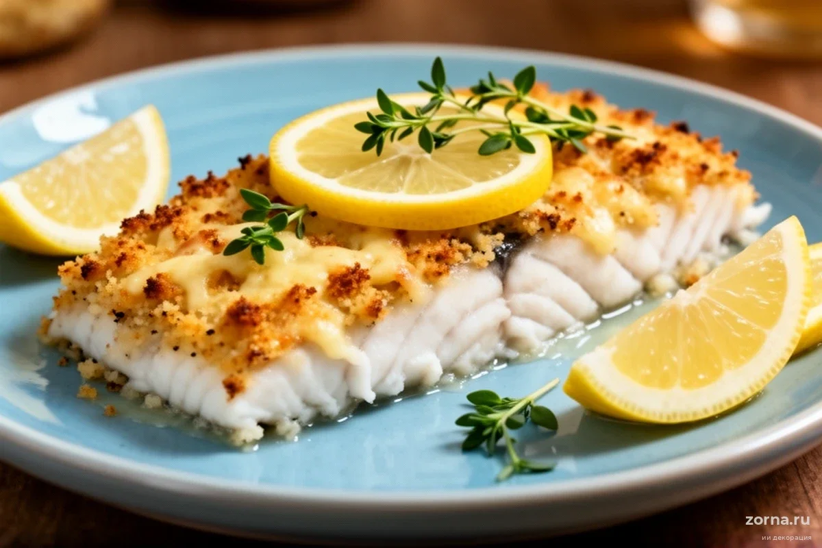 Приготовление проходит в два этапа. Сначала обжарьте куски рыбы на растительном масле по 1–2 минуты с каждой стороны до легкой золотистости. Затем на каждый кусок плотно выложите слой сырно-хлебной крошки, слегка утрамбуйте его. Завершающий этап — запекание в духовке при 200 °C в течение 10–15 минут до образования румяной корочки.
